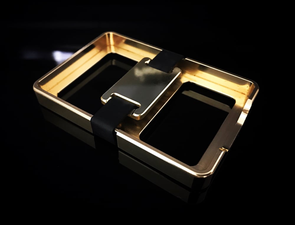 A minimalist aluminum wallet, machined from solid brass. This wallet is designed for minimal every day carry of debit cards, credit cards and cash. The sleek, modern feel is rugged and light enough for every day use. This is a single item available with a matching brass buckle. I am also including two extra bands and a Random Fabrication 3" magnet.