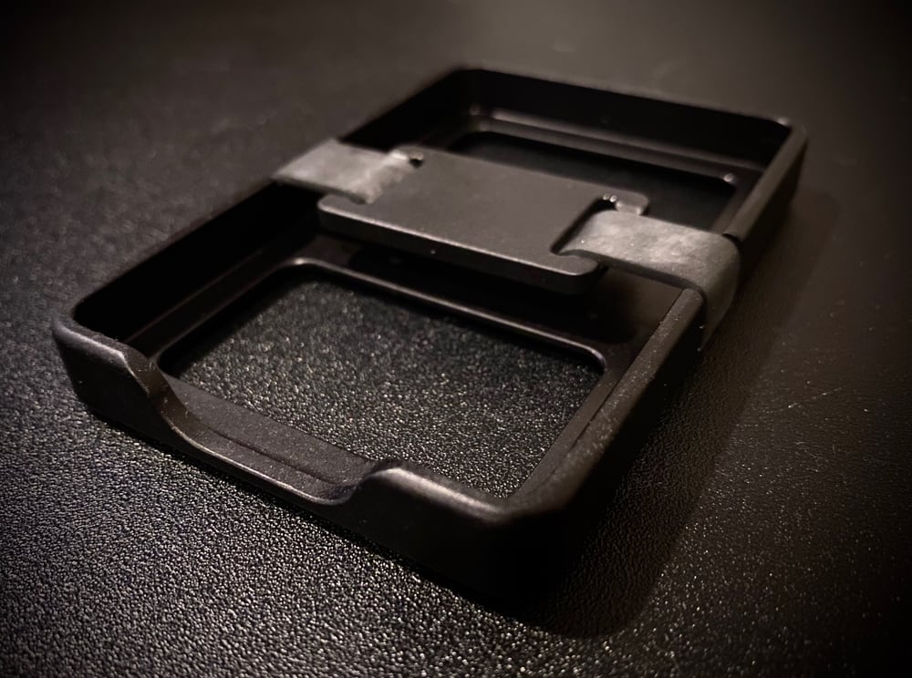 A minimalist aluminum wallet, machined from solid 6061-T6 bar stock and anodized in natural Type II black anodize. This wallet is designed for minimal every day carry of debit cards, credit cards and cash. The sleek, modern feel is rugged and light enough for every day use. This is a single item available with a matching Type III hard anodized grey buckle. I am also including two extra bands and a Random Fabrication 3" magnet.